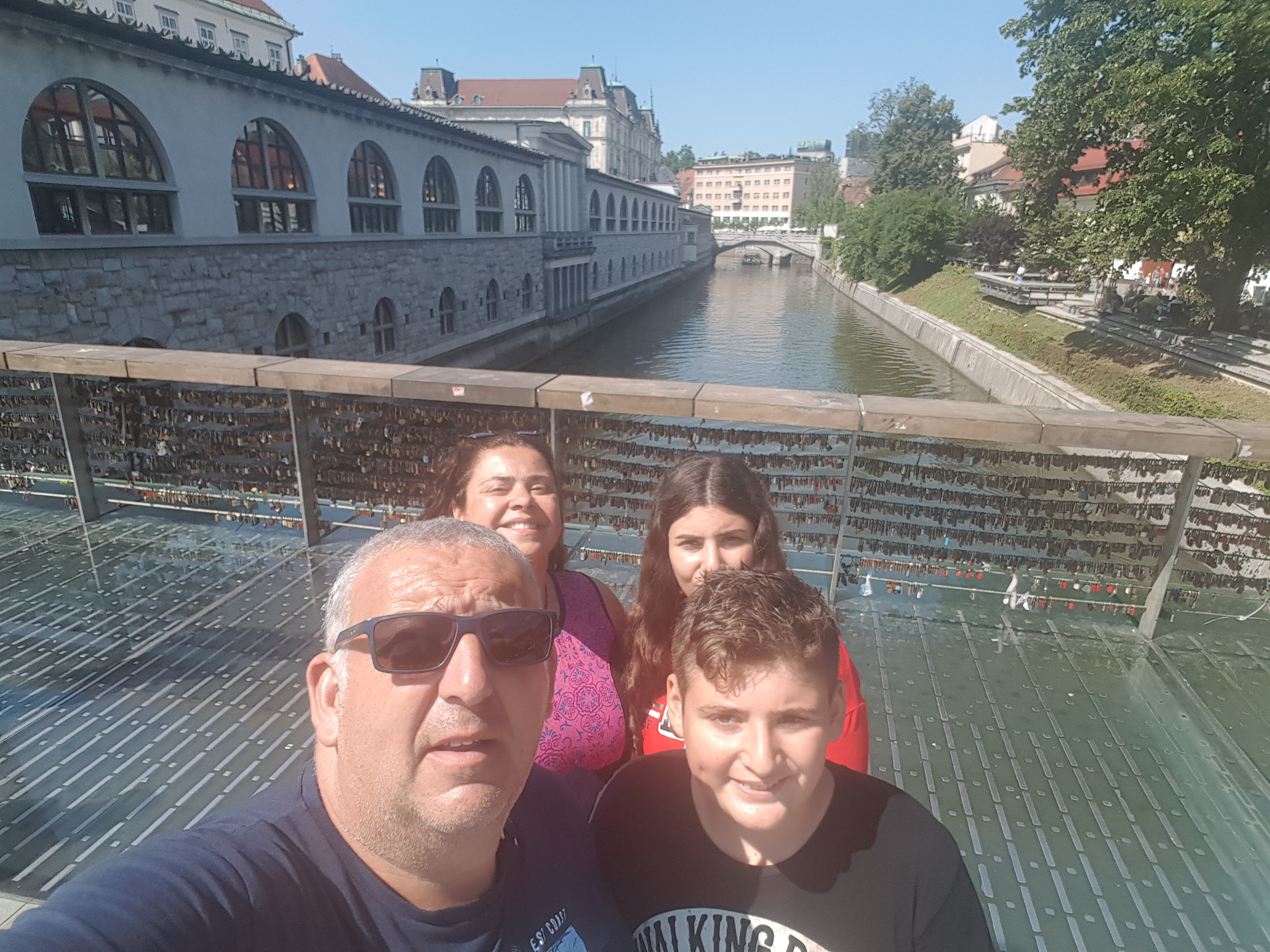 Cruzamos por el puente triple es un grupo de tres puentes que cruzan el río Conecta el Liubliana histórico, medieval y céntrico a un lado, y la ciudad moderna. El puente central está en parte construido con caliza. Fuimos al mercado situado en la ladera del río, el siguiente puente fue el de los carniceros es un puente moderno con una barandilla de hierro y cables de acero. Al más típico estilo parisino, el puente se encuentra repleto de candados, habiéndose convertido en el símbolo del amor de la capital eslovena.