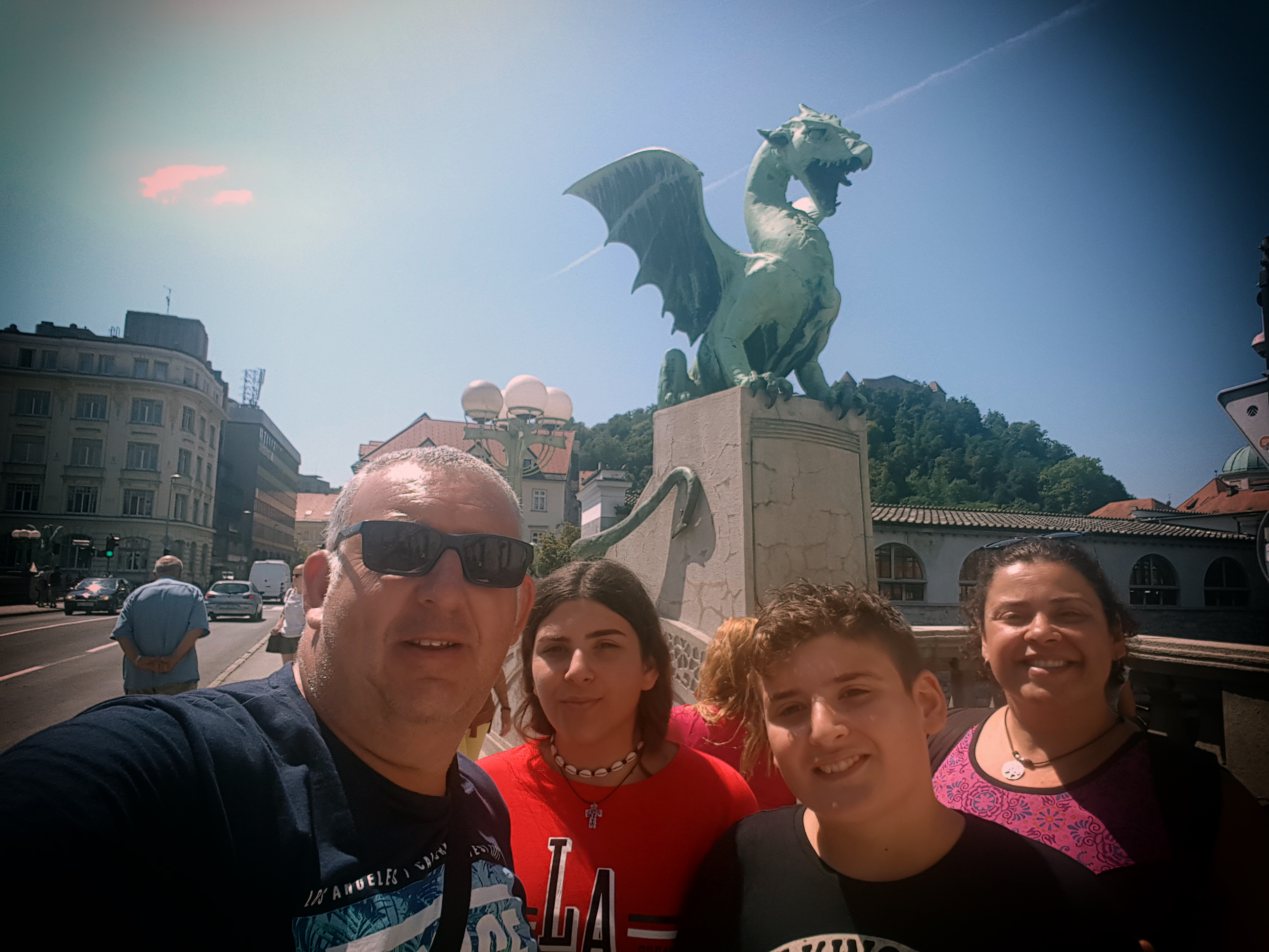 El carril bici nos permitió llegar al centro fácilmente, el centro y sus principales puntos de interés estaban todos muy cerca, todo estaba muy limpio y ordenado, llegamos a la Plaza Preseren es el punto de encuentro principal de la ciudad contiene poesía, religión y lujo en un mismo espacio abierto La Plaza Preseren de Liubliana representa el centro urbano de la capital, y en ella se encuentran localizados algunos de los elementos más característicos y emblemáticos de la ciudad. Situada al pie del castillo, en el corazón histórico de la localidad. Lo más curioso de la plaza es que en verano tiene un aspersor colgado en el medio, y a gran altura, que pulverizaba agua para refrescar a todos los que por allí pasan.