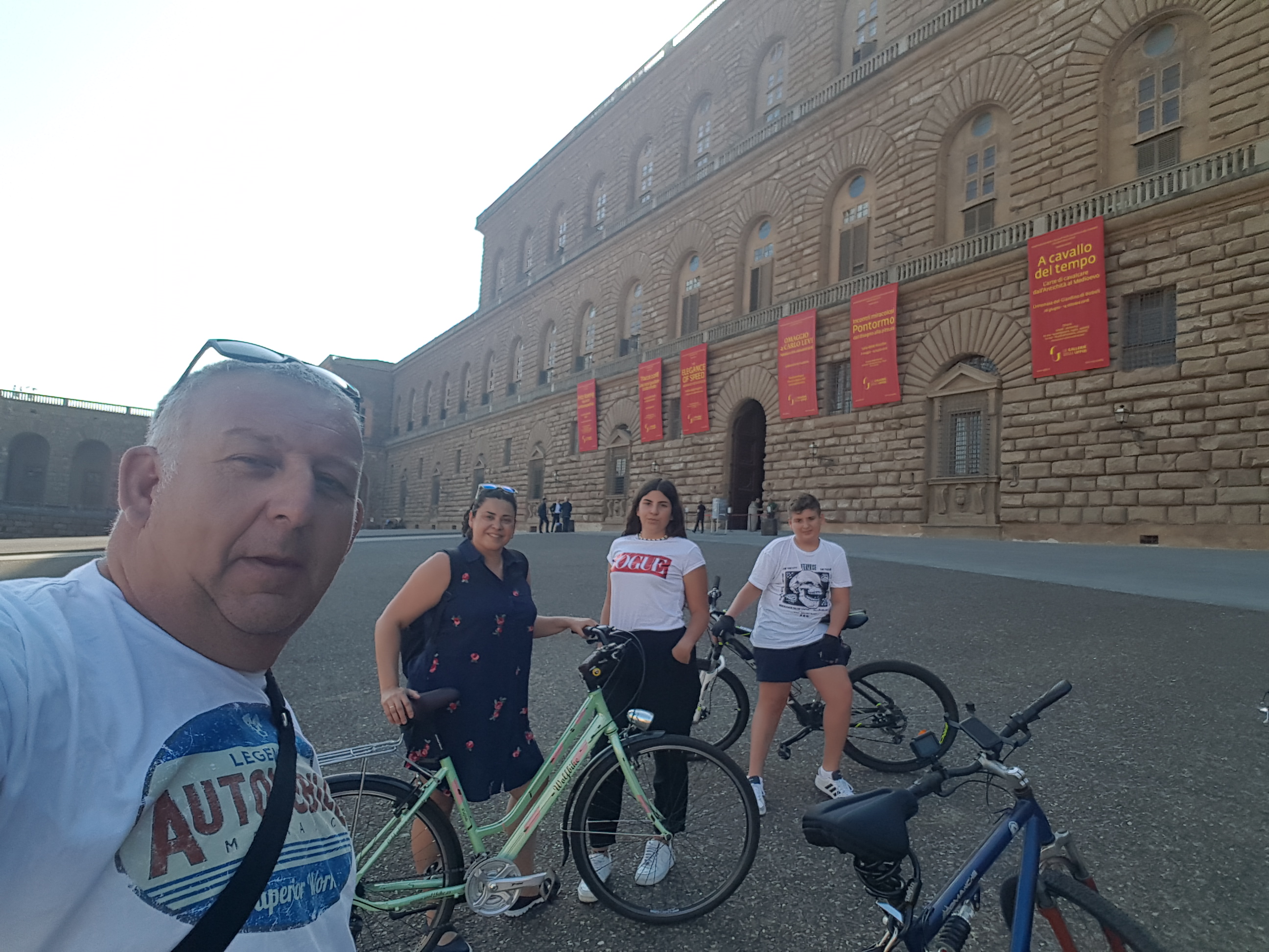 Al día siguiente nos dispusimos a visitar la ciudad y decidimos hacer bicicleta, así que ropa cómoda y al lío. Nada más salir del área y coger la calle lo primero para ir al centro es una cuesta bastante empinada y larga que desciende pero que no posee carril bici. Tras su bajada la gran puerta de la muralla da entrada a sus calles en dirección al Palacio Pitti y los jardines de Boboli, dicho palacio alberga varios museos y fue la residencia de los Medici en Florencía.