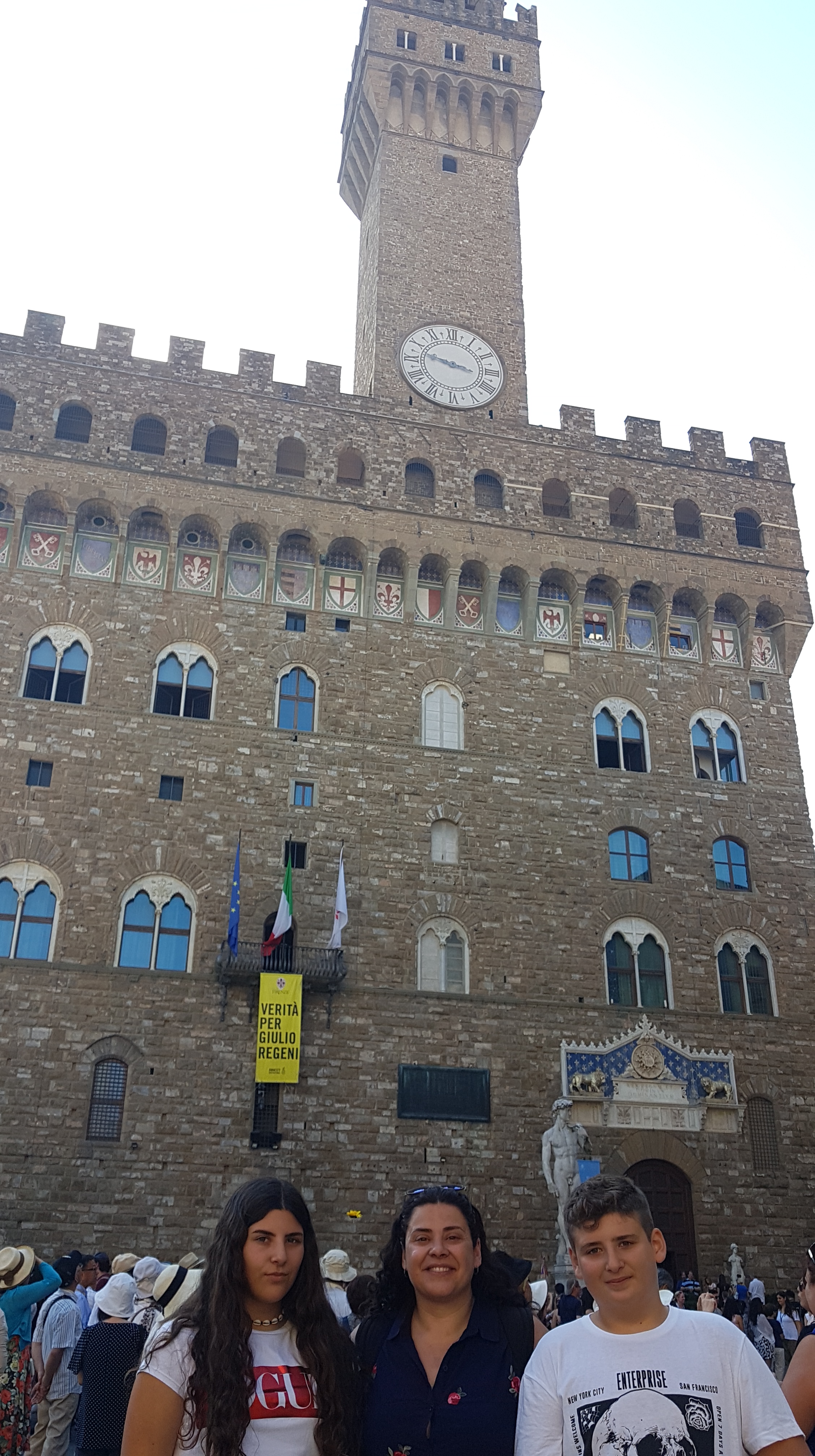 Tras el puente llegamos a la Piazza della Signoria es la plaza más importante de Florencia, en la que se encuentran la torre de arnolfo con 95m altura y 233 escalones, el Palazzo Vecchio, el edificio más característico de la plaza en su entrada encontraréis las esculturas de Adán y Eva, el David de Miguel Ángel (copia) ya que el autentico esta en el interior del museo Uffizi que se encuentra justo al lado. (Las colas eran interminables) y Hércules y Caco, Logia della Signoria, es un pequeño museo al aire libre, en sus soportales se encuentran diversas esculturas como El Rapto de las Sabinas o Perseo con la cabeza de Medusa, la Fuente de Neptuno. Esta plaza sirvió en la antigüedad para cientos de ejecuciones ten cuidado porque puede colarse un fantasma en tus fotos.