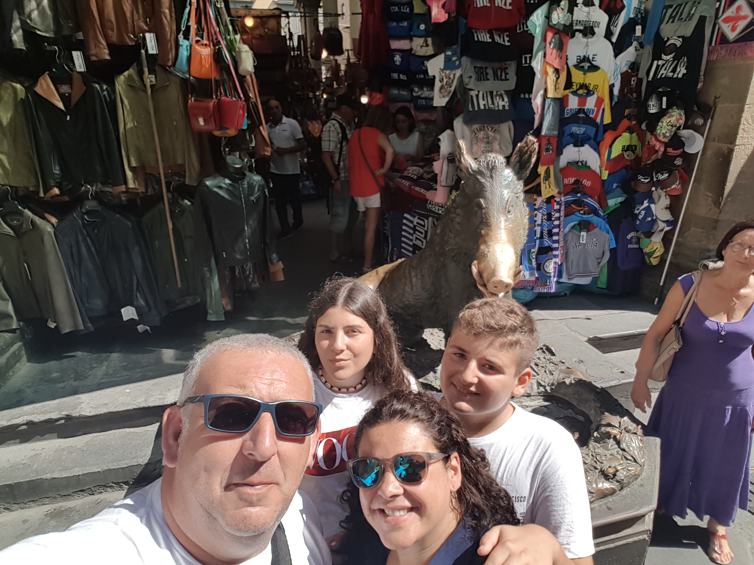LLegamos al Mercado del Porcellino mercado donde todas las tiendas estan dedicados a los artículos de piel y curtidos de mil colores, en este mercado está la fuente del porcellino que tiene una tradición que dice que si le tocas el hocico al porcellino de la fuente tendrás suerte y si tiras una moneda a traves de su boca y cae entre la reja de la fuente el deseo que pides se cumple y si no entra en la reja pues hay que volver a Florencia, Alba y Evaristo Jr. intentaron colar la moneda pero no es fácil… así que tendremos que volver.