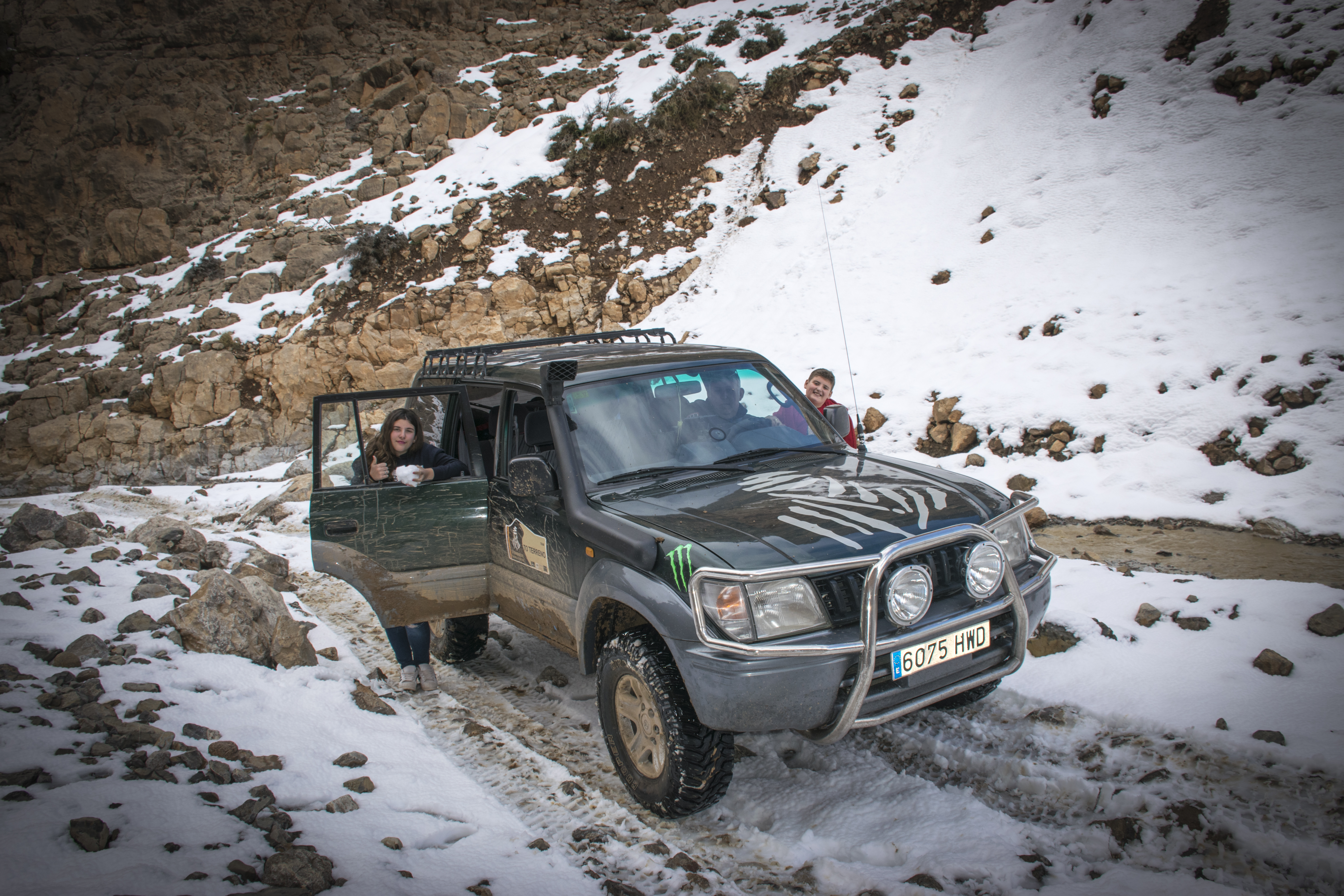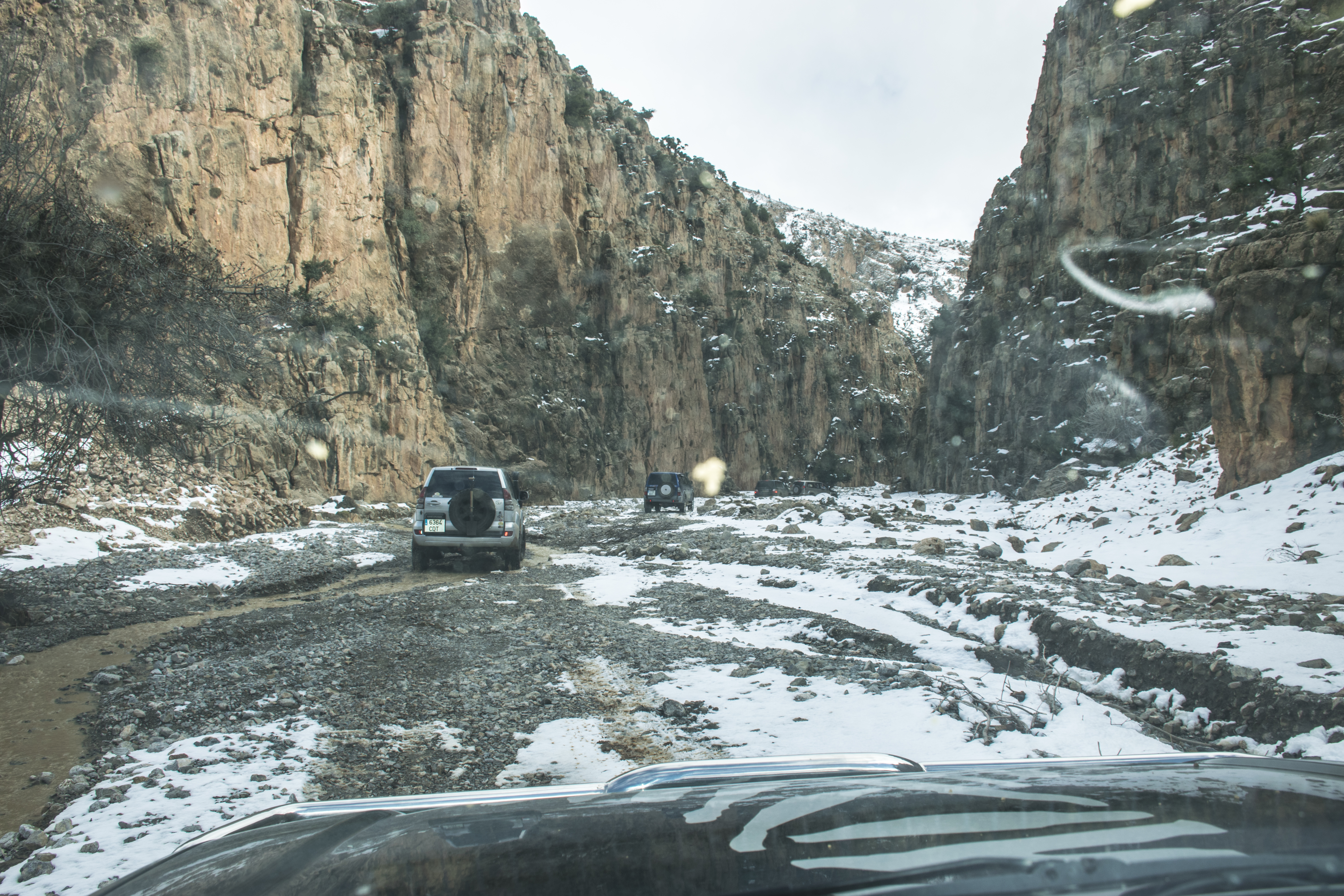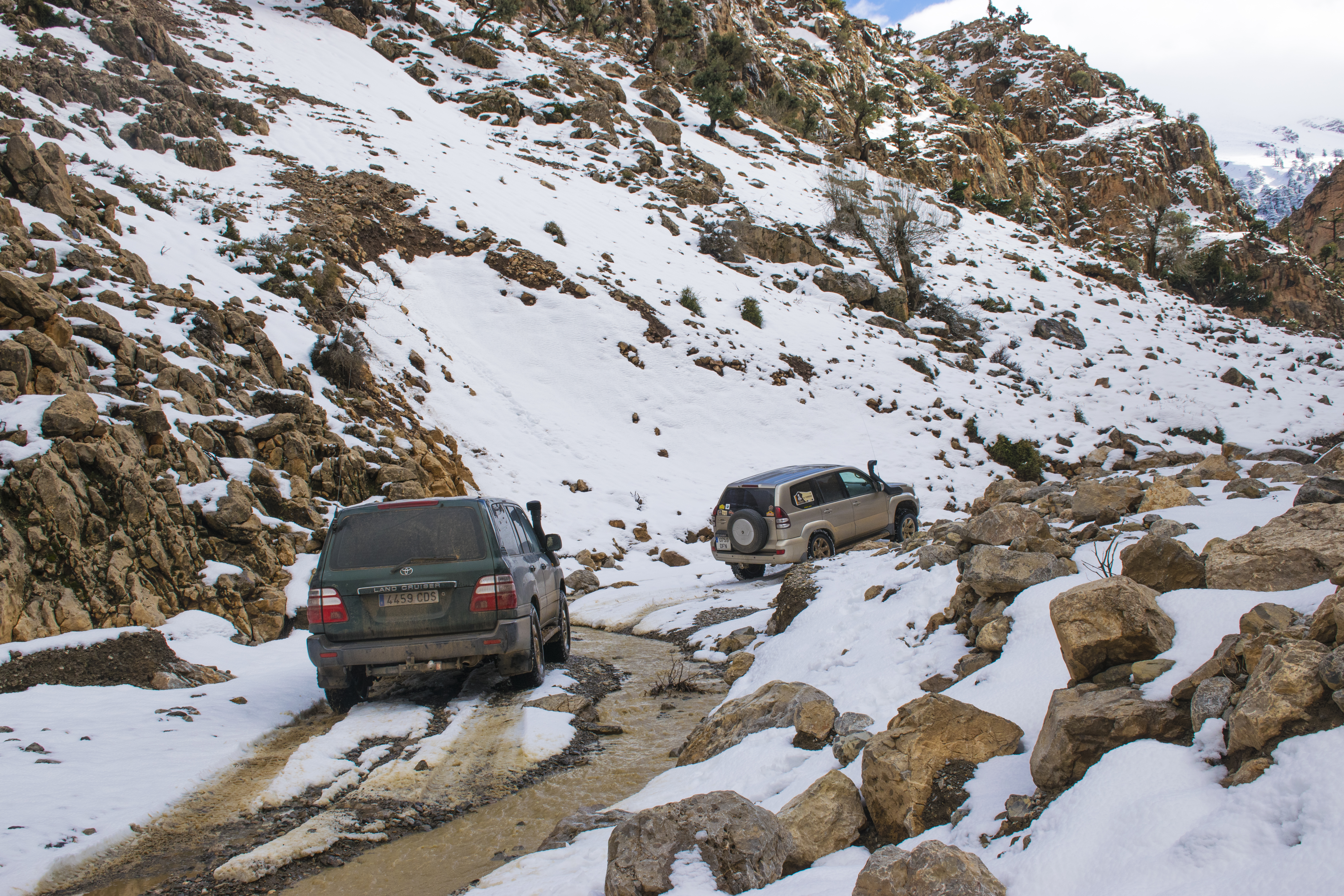Nada mas llegar a las montañas por las pistas y ya estábamos perdidos, (no encontramos la bajada). Tras preguntar a un cabrero nos indico por donde podíamos bajar, el fallo fue mio, porque el Track que tenia lo conseguí a través de un frances que hizo la misma ruta en moto de motocross y la bajada para nosotros era demasiada estrecha para los 4×4. Seguimos buscando hasta por fin encontrar una entrada al desfiladero, un bajada con bastante inclinación, piedras sueltas y algo de nieve, bastante complicada. Hay que bajar con mucho cuidado y muy despacio, la tracción de los coches tiene que ser perfecta, (no podemos permitirnos un fallo, esta en riesgo nuestras vidas). Activamos el 4×4, conectamos reductoras, bloqueos de diferenciales y todos los sistemas que trae nuestro coche para que nos ayude a bajar. No vamos a abandonar a la primera dificultad que nos encontremos.