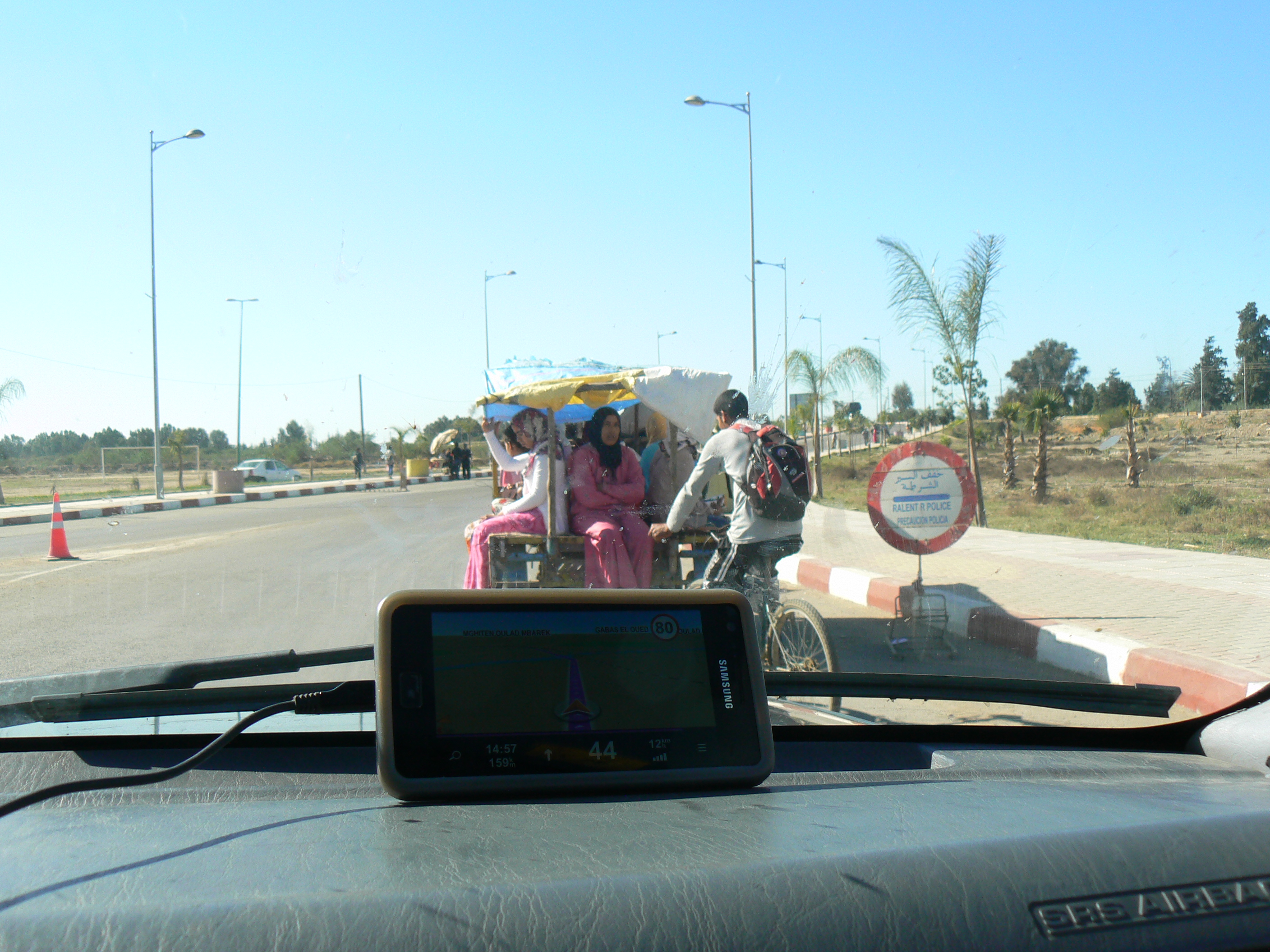 Son las 10.30h, tenemos que repostar gasoil, vamos con los tanques casi vacíos, siempre lo hacemos así porque en Marruecos el diésel y la gasolina son más baratos que en España (unos 25/30 céntimos el litro de media menos). Tras ello, carretera y manta. Nuestro primer tramo, 270 kms desde Tanger med hasta Mequinet. (Meknes) unas 4 horas de camino. 100 kms por autopista y unos 170 kms por carreteras llenas de animales sueltos, niños andando y en bicicleta y mucho trafico de camiones, hay que tener mucho cuidado con los radares y respetar siempre los limites de velocidad, en Marruecos existen muchos controles de trafico. Toda precaución es poca. Intentamos no parar, queremos llegar temprano para aprovechar e ir al zoco y hacer algunas compras.
