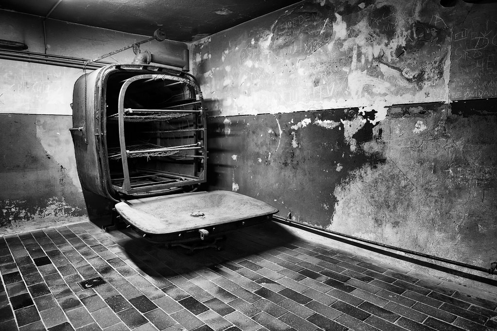 Y poco a poco llegamos al Nº22 Crematorio y zona de ejecuciones. Durante todo el recorrido en el que estuvimos durante 3 horas sobrecogía el silencio de todos los visitantes, la respiración entre cortada, el nudo en la garganta y lágrimas contenidas, el respeto hacia todos los que pasaron por allí o sufrieron las mismas vejaciones, maltratos, sufrimiento, horror y terror en cualquier campo de concentración de todos los que hubo. Entramos en la zona de ejecuciones por gas y los tres hornos crematorios fue espeluznante, los vellos de punta, una angustia y sentimiento de rabia e impotencia te sobrecogía, la pila de autopsia donde hacían experimentos con ellos, la nevera donde apilaban los cadáveres para su incineración, los azulejos, el suelo y las rejillas de desagüe indescriptibles. La zona de exterminio y los crematorios se encuentran en estas salas del sótano. Estos crematorios fueron utilizados por las SS no solo para deshacerse de los cadáveres, sino también para eliminar los rastros de violencia y abandono visibles en esos cadáveres. Distintos destacamentos de prisioneros fueron los responsables de quemar los cadáveres. Fueron alojados en este sótano, aislados del resto del campamento. A partir de 1941, las instalaciones para la matanza en masa se instalaron aquí: una sala de ejecución con un aparato para disparar a las personas en la parte posterior del cuello y una horca. A principios de 1942, las SS comenzaron a operar una cámara de gas. Hasta mayo de 1945, al menos 3,500 prisioneros murieron en él usando el gas venenoso Zyklon B.