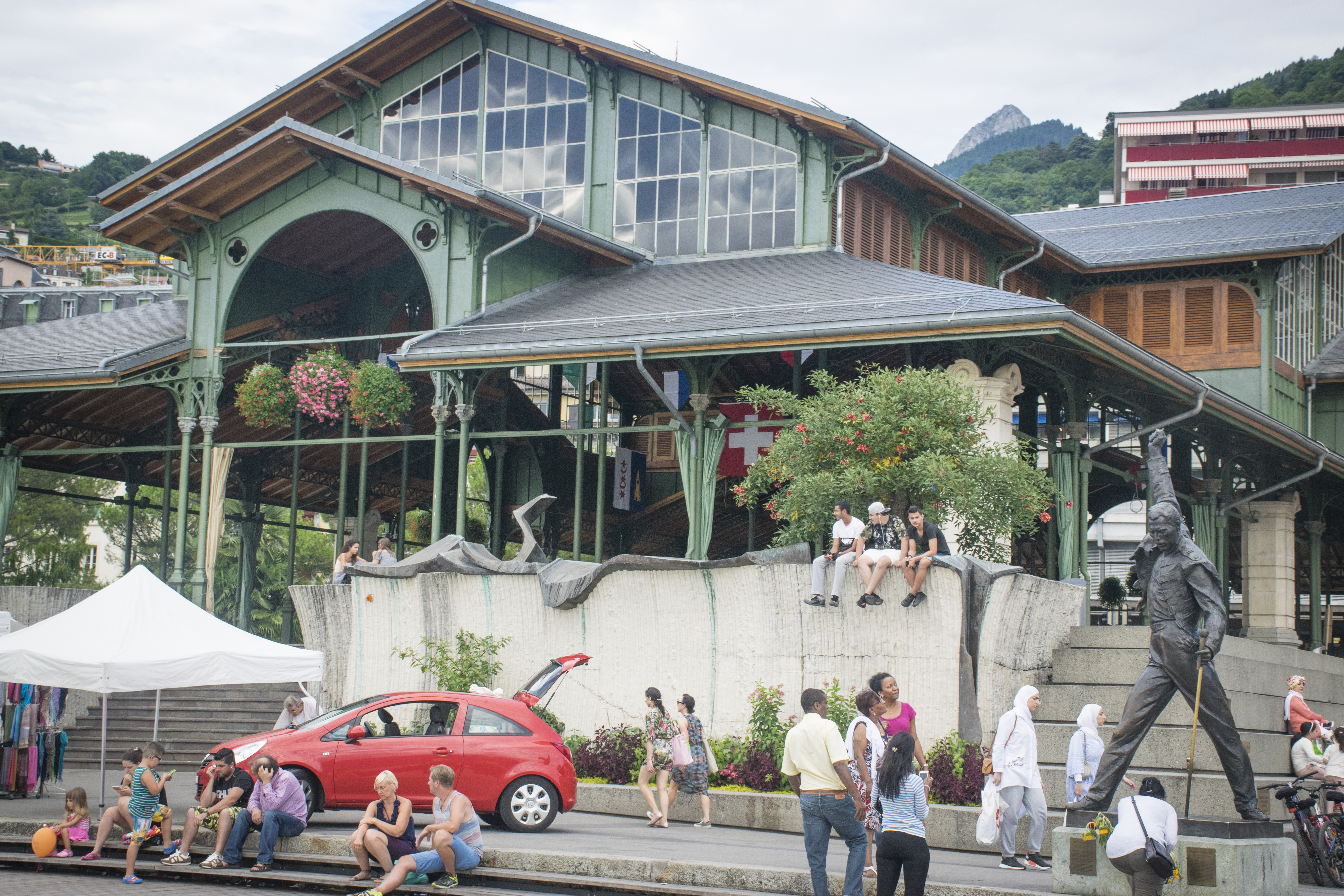 Y seguimos… llegamos al Mercado cubierto y su noria, justo en frente, a la orilla del lago Lemán, hay una plataforma redonda, en la que si te sientas y disfrutas del atardecer parece que te envuelve una magia, paz y tranquilidad acompañada por un paisaje de ensueño. En la entrada de esta plataforma está la espectacular figura a tamaño real del gran Freddie Mercury, cuyas cenizas fueron arrojadas al Lago Lemán tal como lo pidió él mismo, cabe recordad que Montreaux fue la cuidad elegida por este cantante para vivir.