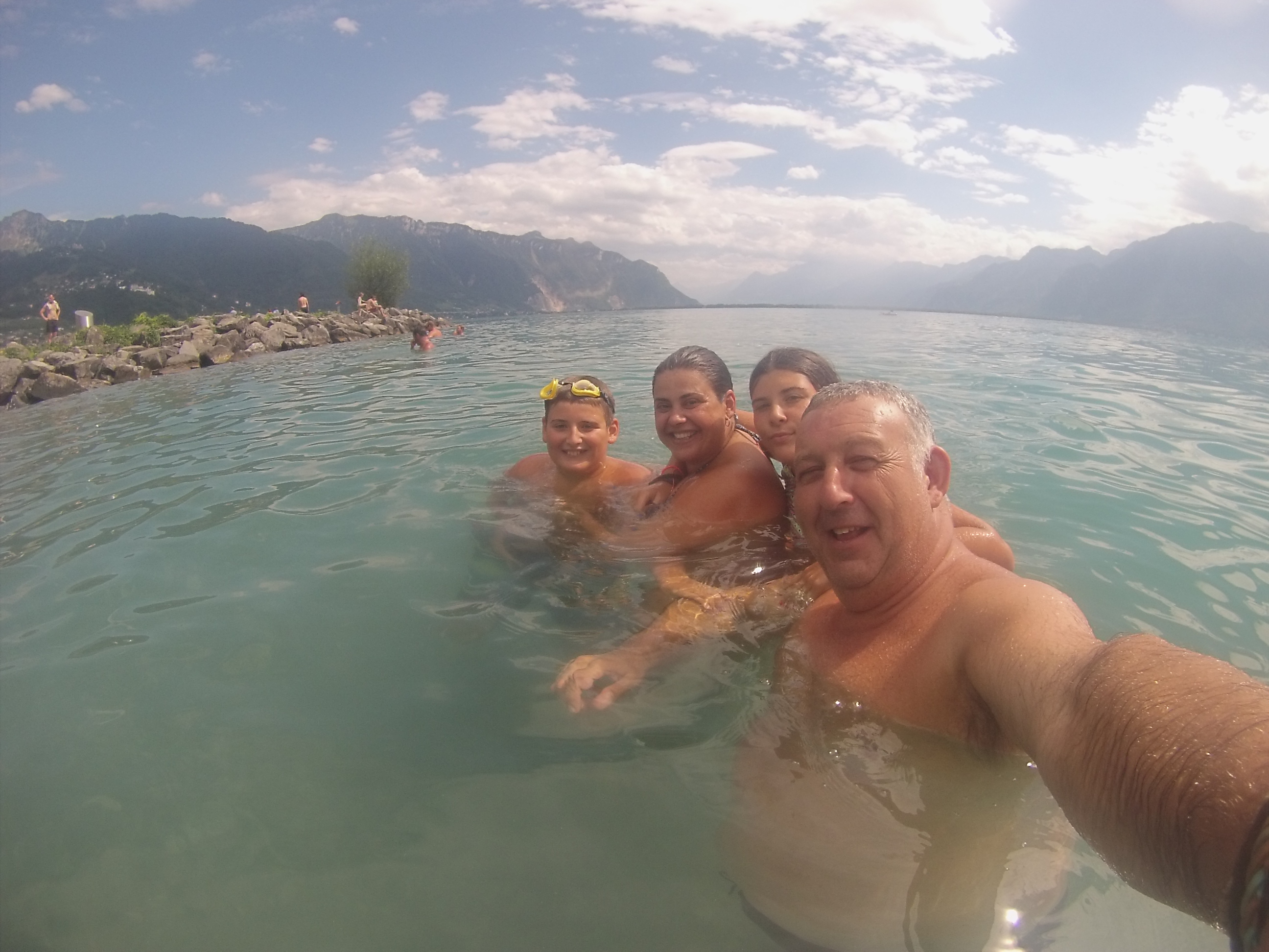 Justo al lado de donde aparcamos existe una pequeña playa artificial donde pudimos disfrutar de un buen baño refrescante en el Lago Leman donde se celebra el Montreaux Chill Festival, es una zona donde hay chiringuitos de comida y tiendas de estilo hippie supercool, ambientado por música en vivo, arboles, etc.