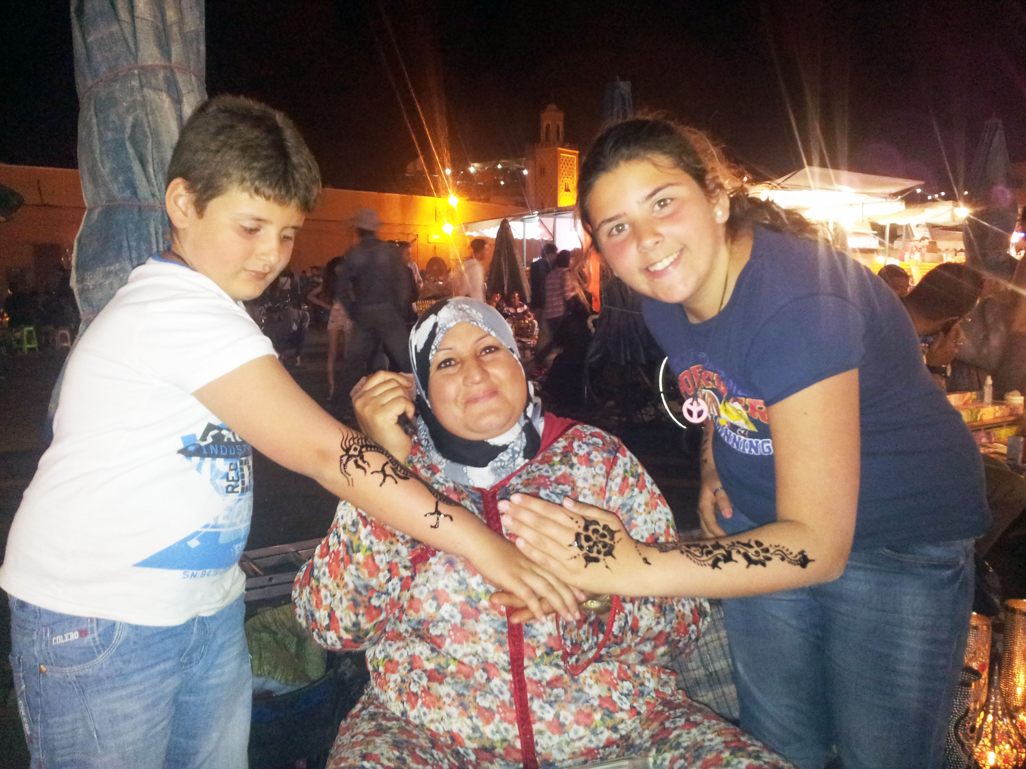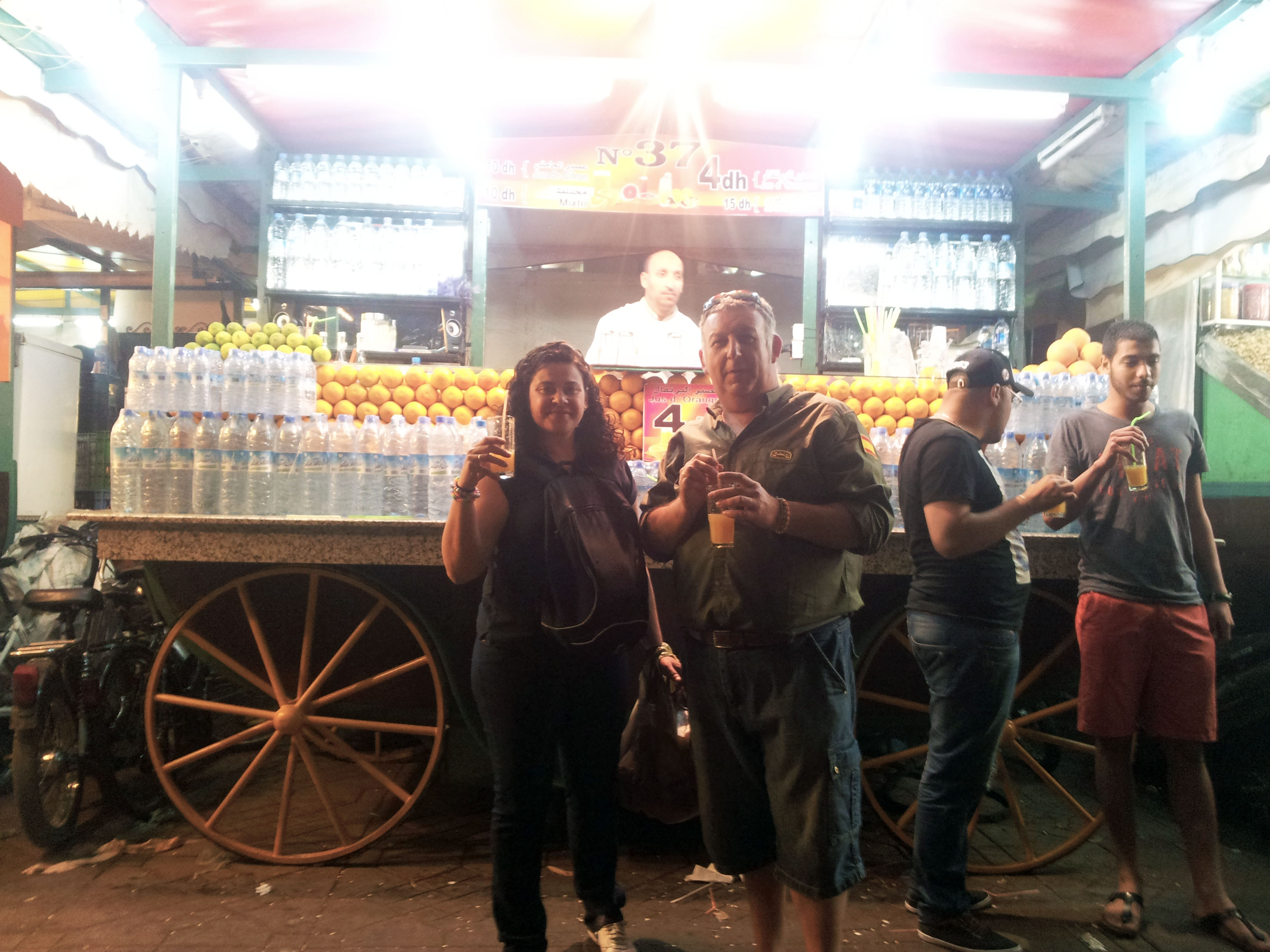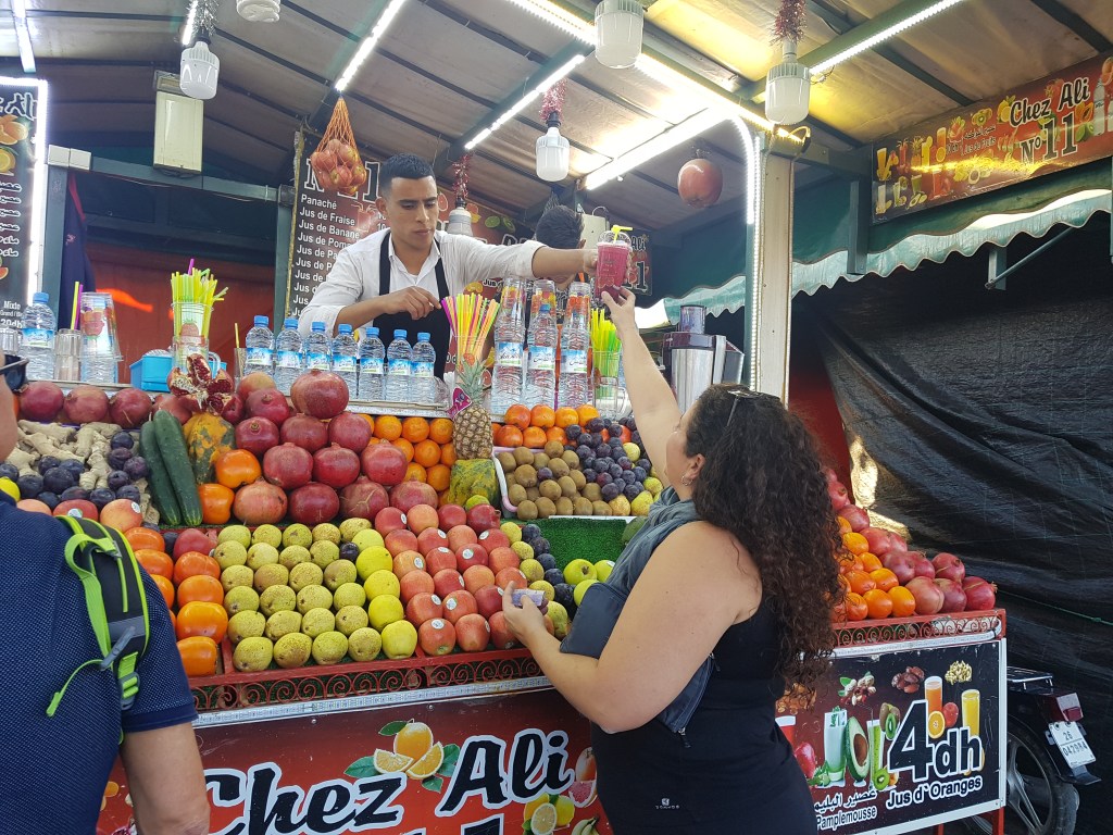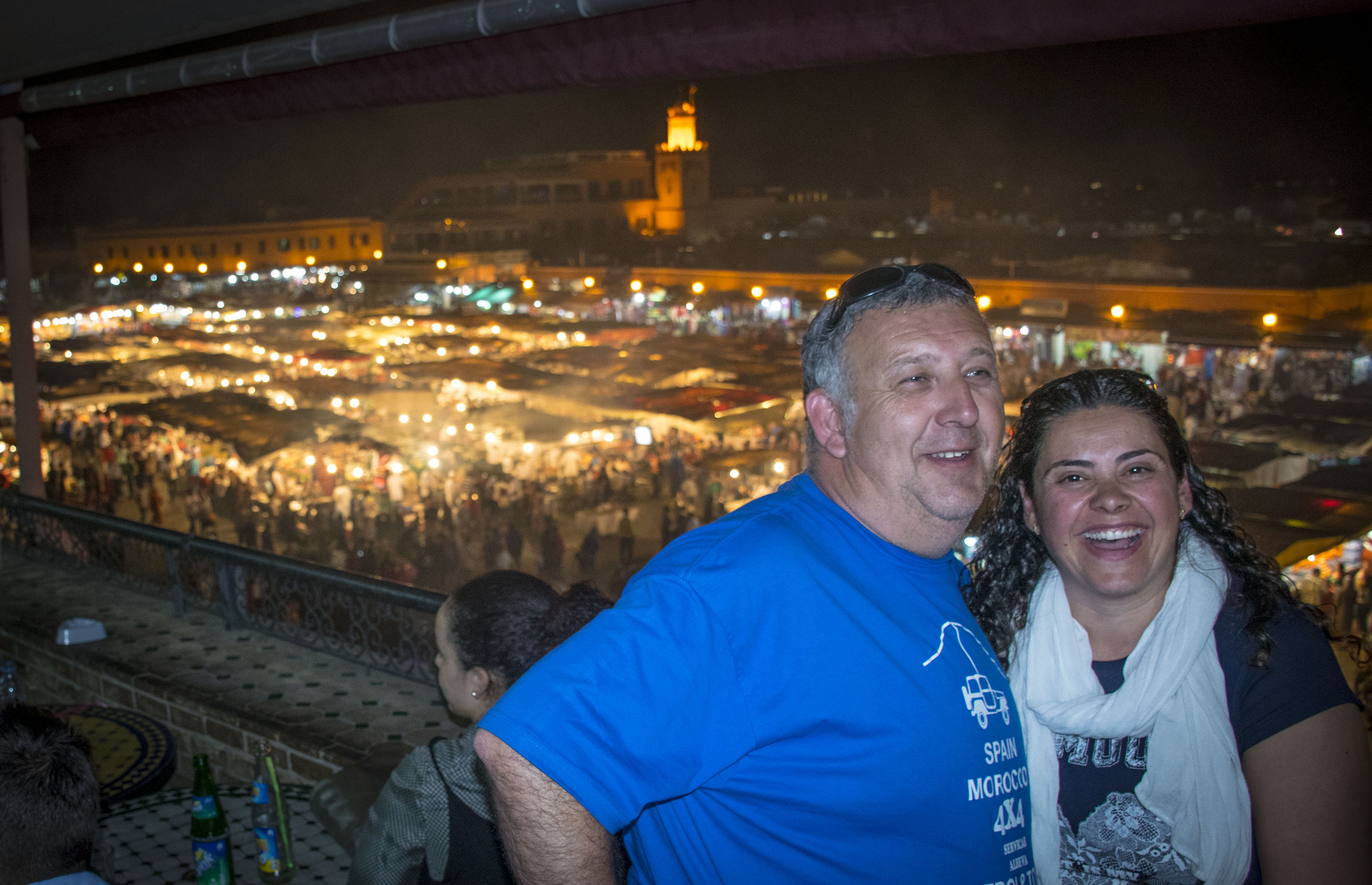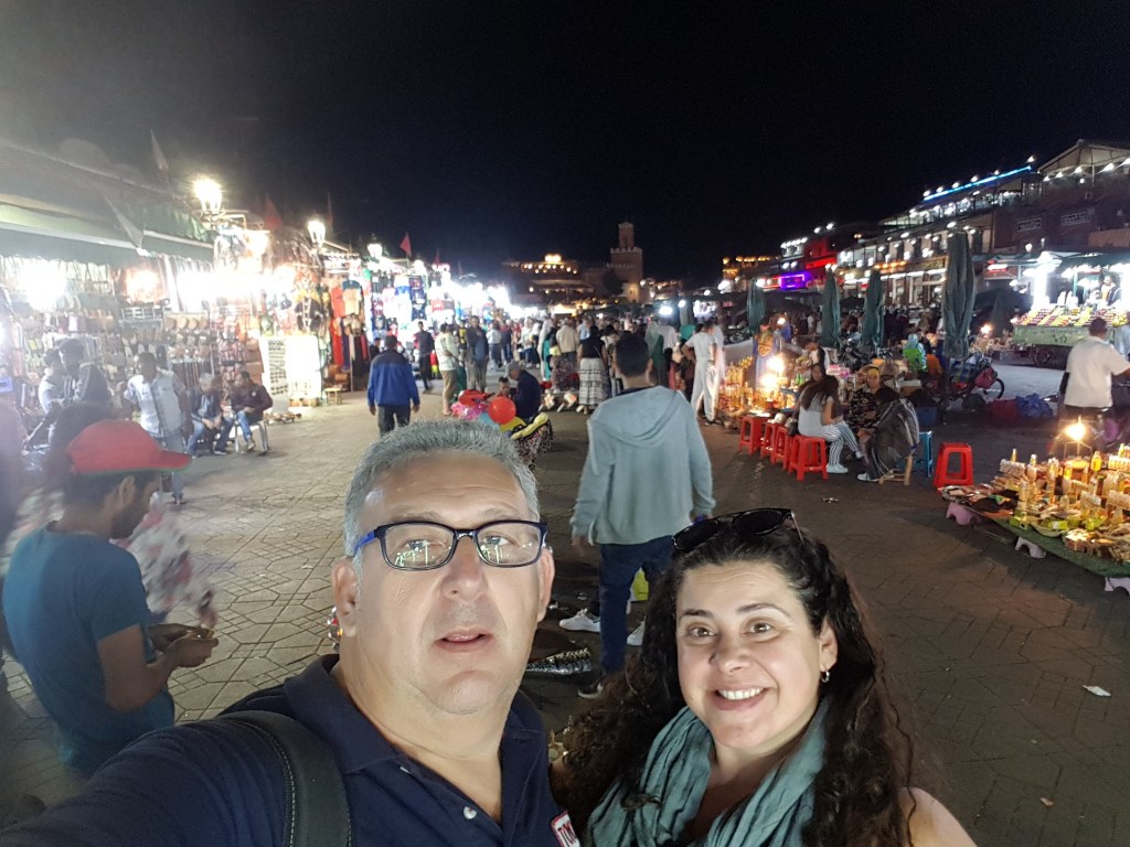 - La Plaza de Jemaa el Fna es el corazón y la principal plaza de la ciudad, mágica y misteriosa. Esta plaza es el punto de encuentro y el corazón de la medina. Aquí encontraréis vendedores de todo tipo, puestos para comer, puestos de zumos y caracoles, encantadores de serpientes, monos, músicos, malabaristas, pintores de henna. Hay que verla tanto de día como de noche ya que son dos ambientes muy distintos. Es imprescindible subir a cualquiera de las terrazas que asoman a la plaza, a tomar un té, ver el atardecer y el bullicio que se va formando . Nosotros subimos al Café Glacier, son lugares más caros, pero merece la pena por el espectáculo de la calle.
