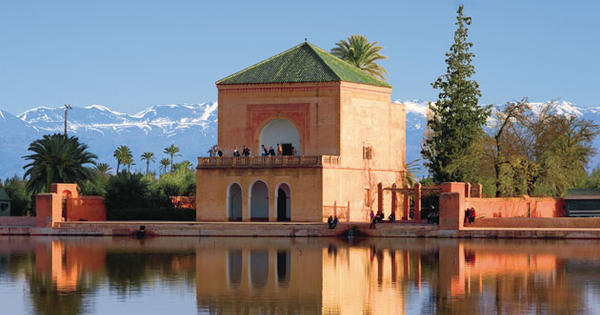 - Los Jardines Menara, es uno de los jardines más conocidos y fotografiados. Junto al jardín encontramos un hermoso pabellón cubierto de tejas verdes, es una de las estampas más bonitas típicas de la ciudad, con las montañas del Atlas al fondo. Estos jardines se encuentran en el extremo sur, a unos 45 minutos a pie de la plaza Jemaa el Fna. Está poblado por árboles frutales y olivos, y un enorme estanque artificial. Otro oasis en Marrakech. Actualmente no está muy bien cuidado.