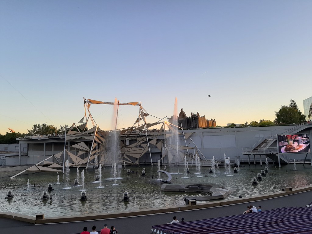 Grandes Espectáculos: – El espectáculo nocturno del lago, Un big bang de efectos visuales, acuáticos y pirotécnicos. En una constelación de escenas mágicas, fuimos testigo del fascinante encuentro entre una chica real y un gigante virtual que tiene los pies en la tierra y la cabeza en el cielo Inspirado por la originalidad de la arquitectura del parque y de sus pabellones orientados hacia el cielo, le Cirque du Soleil ha concebido este espectáculo personalizado para Futuroscope. Un espectáculo sin artistas presentes pero que intervienen por la magia de las imágenes y de los efectos especiales. En una nueva escenografía, un dispositivo técnico impresionante se desarrolla en una escena acuática de 7000 m²: nuevos efectos pirotécnicos y acuáticos, proyecciones en pantallas gigantes de agua, juegos de luz y de láser inéditos. Una estructura original de 35 metros de altura compuesta por una pantalla y una pared de agua que dan forma a un espectáculo mágico. Es recomendable estar 30 min antes para no quedarte sin sitio.