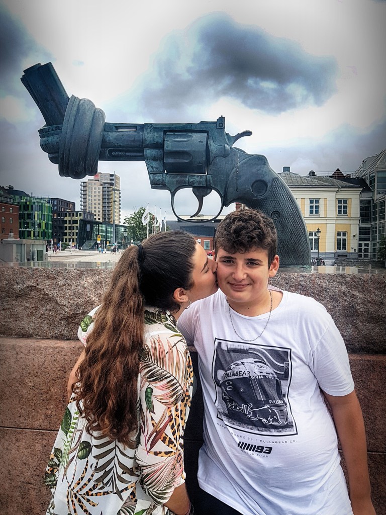 Comenzamos a caminar para ir a buscar todo lo que esta ciudad puede ofrecernos la temperatura es de 18º y el día esta un poco nublado. Lo primero que nos encontramos es con una peculiar escultura llamada «Knotted gun« el revolver anudado, una escultura de bronce que se ubicó en el Strawberry Fields Memorial de Central Park, en Nueva York y que hoy tiene más de treinta réplicas se reparten por todo el mundo: Malmö, Lausana, Pekín, Londres o Ciudad del Cabo… como símbolo de la no violencia, trata de inspirar a la juventud de todo el planeta bajo el lema: la violencia acaba cuando la educación empieza, para que resuelvan sus conflictos por medios pacíficos.