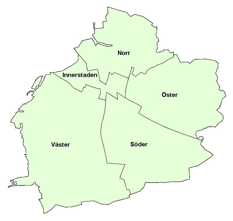 El municipio está dividido en cinco distritos urbanos. Innerstaden: centro de la ciudad, Norr: norte, Öster: este, Väster: oeste, Söder: sur. El urbanismo de la ciudad ha evolucionado en función del desarrollo industrial y de la llegada de nuevos habitantes. En el casco antiguo (Gamla Staden), rodeado por un canal, pueden encontrarse los edificios más turísticos como la Iglesia de San Pedro, El Castillo, el Ayto, El Centro alberga las plazas de Gustavo Adolfo, la Plaza Mayor (Stortorget) y la Pequeña Plaza (Lilla torg), así como la avenida de Södergatan.