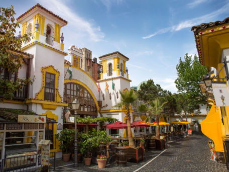Fachadas blancas con pintorescos torreones, flores en la plaza, balcones con balaustradas, puertas y fuentes moriscas, tejas y azulejos: si paseas por la zona de temática española, te sentirás transportado al casco antiguo de Sevilla.