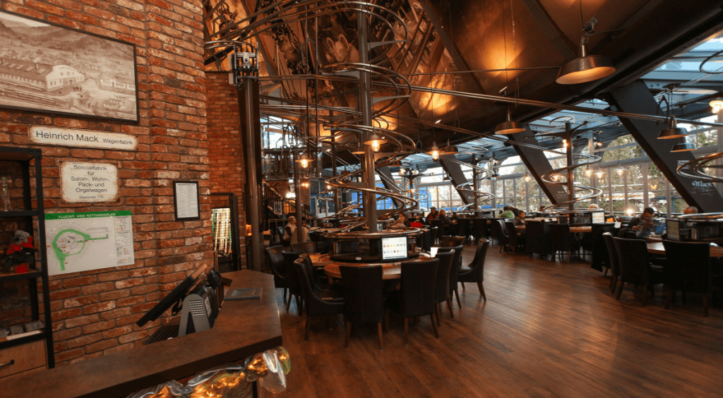 O si tienes hambre entra en «FoodLoop» El primer restaurante en bucle del mundo. ¡Experimenta la gastronomía al más alto nivel! El restaurante circular «FoodLoop» tiene 215 asientos en dos pisos con una vista maravillosa sobre el parque. Cada mesa está equipada con pantallas táctiles para ordenar la comanda. Las cacerolas y las botellas se transportan a través de un ingenioso sistema de rieles, parece una montaña rusa, que lanzan directamente lo pedido a la mesa. Un sistema único en el mundo!.