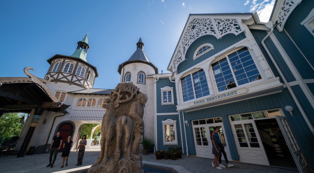 Estas áreas, están una al alado de la otra, nos sigue deslumbrando la arquitectura de las casas y decoración, como en todas las zonas está muy bien conseguida. Se encuentra llena de detalles y con agua por todas partes. En la zona de Escandinavia podemos disfrutar de «los rápidos«, montados en unos círculos vamos bajando una río. Un tiburón colgando es una foto obligada de un día de pesca.